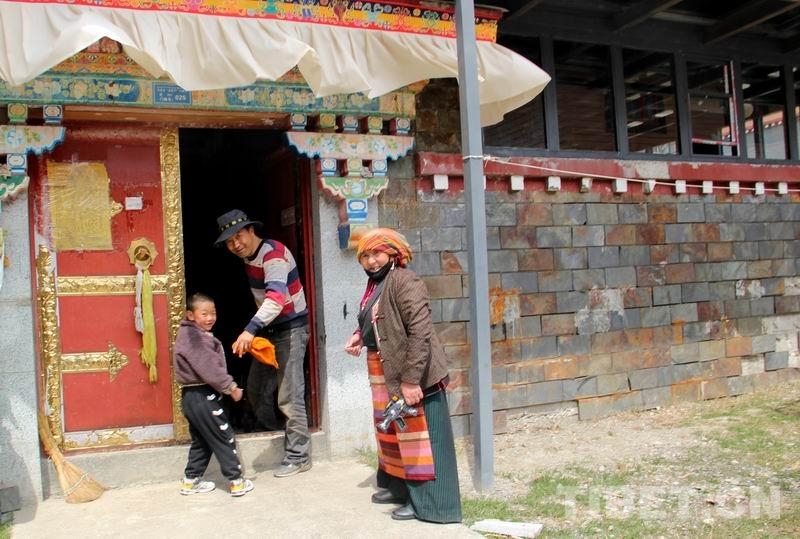 圖為次卓瑪與女婿拉巴多吉正在家門口招呼剛剛放學(xué)的小外孫回家吃飯 攝影:劉莉