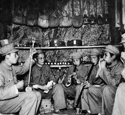 《歌唱祖國(guó)》的作者王莘(左二)在抗美援朝戰(zhàn)場(chǎng)防空洞內(nèi)教志愿軍戰(zhàn)士演奏這首歌曲。