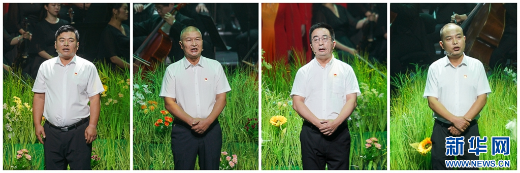 7月17日晚上,來自基層的村干部鞏保雄(左一)、高泉偉(左二)、俞小平(右二)和施金通(右一)走上舞臺,深情講述《新時代——我做鄉(xiāng)村振興答卷人》。新華網(wǎng) 肖和勇 攝