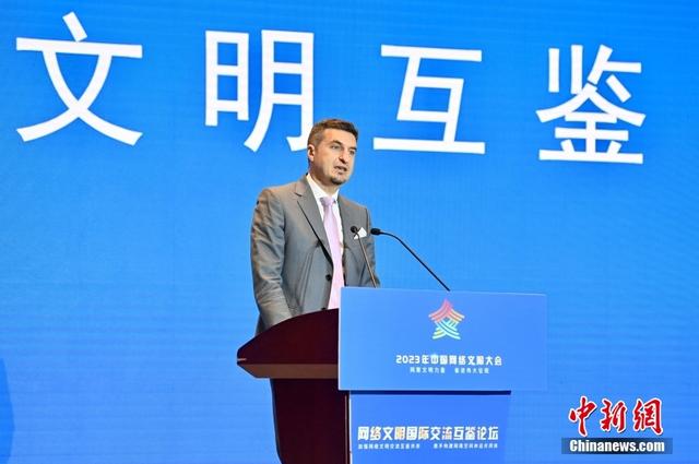 7月18日,2023年中國網(wǎng)絡文明大會網(wǎng)絡文明國際交流互鑒論壇在廈門舉辦。中外嘉賓圍繞加強網(wǎng)絡文明交流、互鑒、共存等話題展開探討。圖為中國—阿拉伯國家博覽會顧問委員會委員肖克作主題演講。中新社記者 王東明 攝